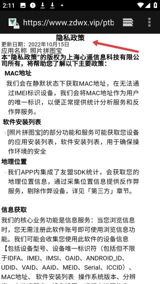 3、點擊應用的隱私政策頁面,更新于2022年10月15日,介紹了MAC地址等信息獲取及使用相關內容。
