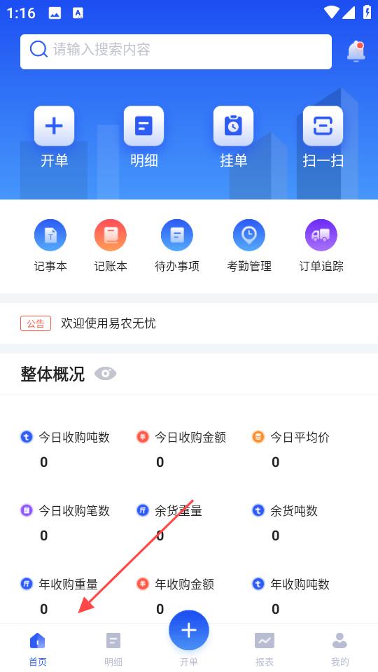 1、首頁界面,有開單、明細等功能入口,還有記事本、記賬本等實用工具,用戶可查看整體概況,包括今日收購噸數、金額等數據。