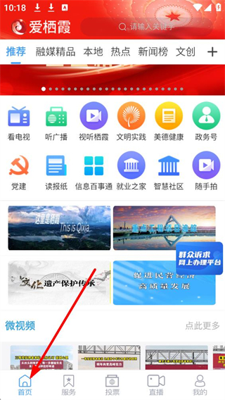 1、打開愛棲霞APP,進入首頁,可看到推薦、融媒精品等欄目,展示多個功能入口和本地資訊,點擊底部我的按鈕進入個人界面。
