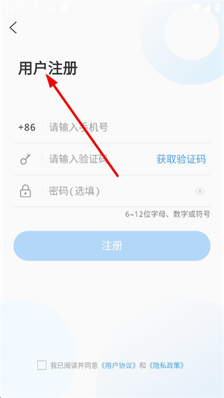 4、若未注冊,用戶登錄界面點擊快速注冊進入用戶注冊界面,輸入手機號、驗證碼,選填密碼后勾選同意協議點擊注冊,完成注冊后即可登錄使用APP功能。