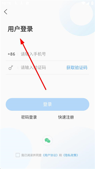 3、進入用戶登錄界面,需輸入手機號、驗證碼,勾選已閱讀并同意用戶協議和隱私政策后點擊登錄,也可選擇微信登錄方式。