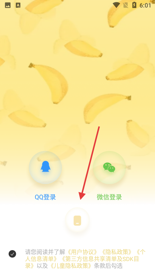 1、登錄界面以香蕉為背景,提供QQ、微信兩種快捷登錄方式,底部提示需閱讀多項協議條款后勾選確認。