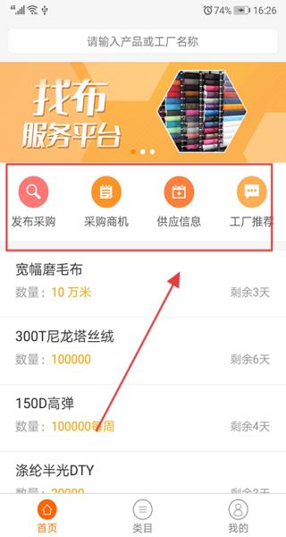 1、首頁有找布服務平臺,設發布采購、采購商機、供應信息、工廠推薦功能鍵,方便用戶發布需求、獲取商機和工廠推薦信息。