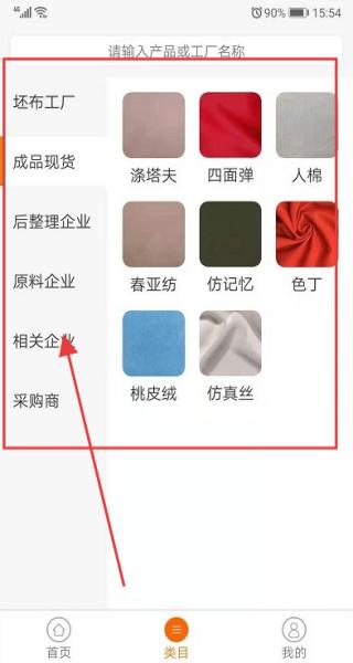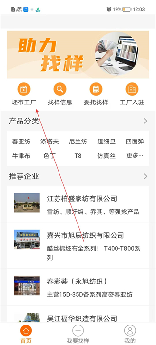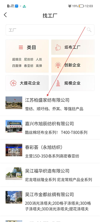 1、進入軟件首頁找到坯布工廠功能入口,點擊進入找工廠,瀏覽類目分類及推薦企業列表,選擇感興趣的企業準備查看詳情。