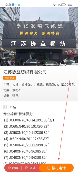 4、在企業詳情頁查看其專業棉錦滌彈力等產品信息,可選擇收藏備注該企業,或點擊撥打電話按鈕與企業取得聯系。
