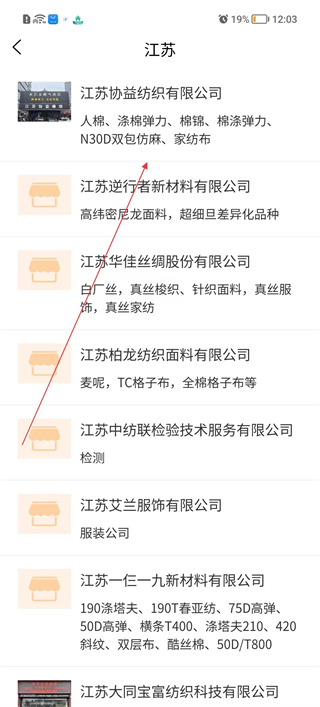 2、在找工廠頁面選擇一家企業如江蘇柏盛家紡有限公司,點擊進入對應地區的企業列表頁面,查看該區域內的相關紡織企業。