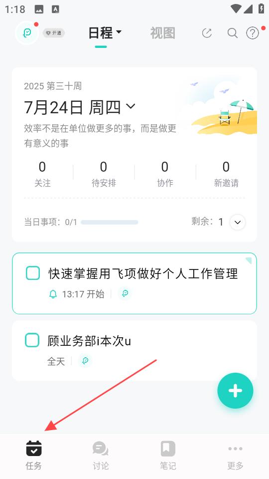 2、任務界面,顯示日程,有快速掌握用飛項做好個人工作管理等任務,可查看關注、待安排等事項數量。