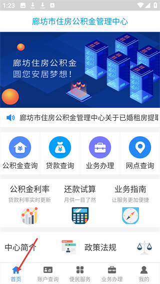 1、首頁展示廊坊市管理中心服務,有公積金查詢等功能入口,還有利率試算等板塊,可獲取政策及業務指引。