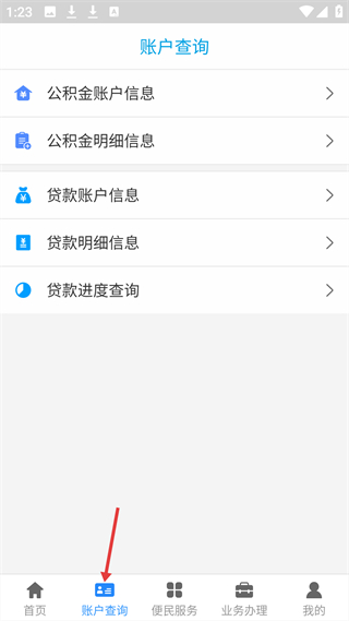2、賬戶查詢頁可查詢公積金賬戶、明細信息及貸款賬戶、進度,方便用戶精準掌握公積金和貸款的賬戶動態。