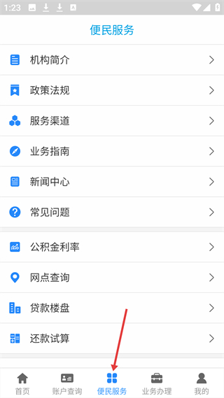 3、便民服務頁含機構簡介等功能入口,還有公積金利率、網點查詢等服務,可深入了解公積金政策、查詢服務渠道及業務辦理指南。