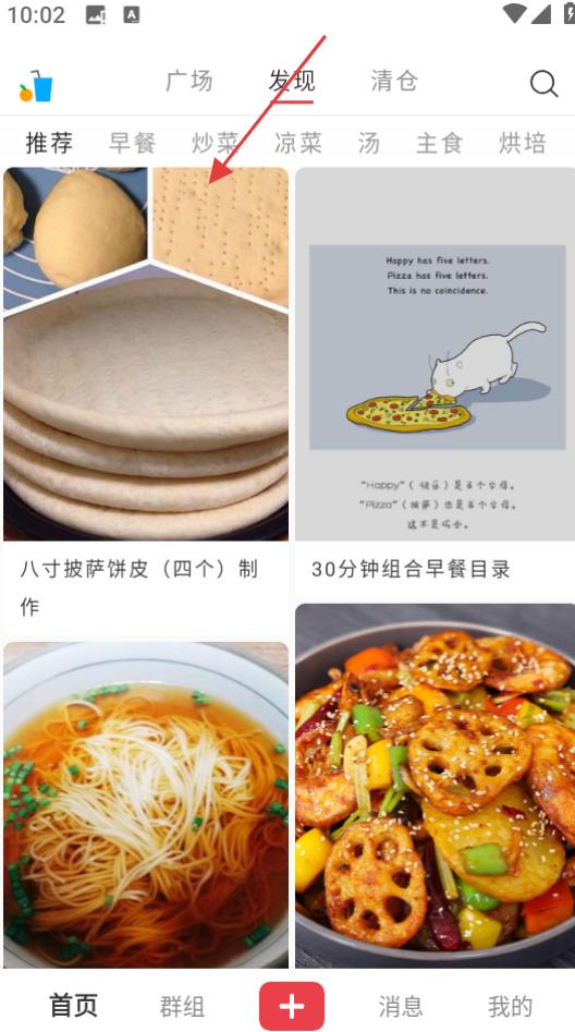1、發現頁面有廣場、清倉等分類,推薦早餐、炒菜等內容,展示八寸披薩餅皮制作、30分鐘早餐目錄等美食相關分享。