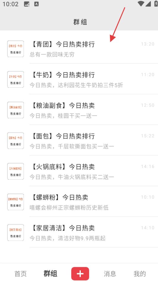 2、群組頁面羅列青團、牛奶等熱賣排行群組,含商品優惠信息,如牛奶拍三件5折、桂圓干買一送一等。