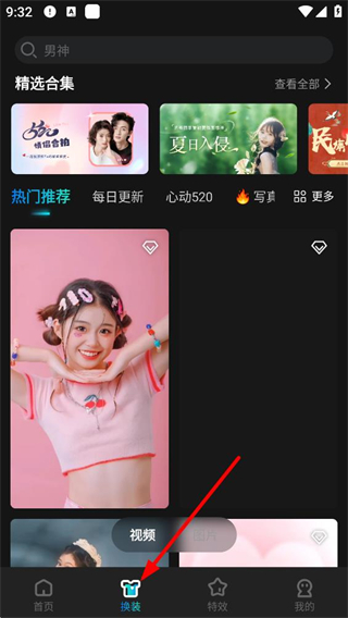 4、點擊換裝選項,進入換裝界面,可看到精選合集和熱門推薦的內容,有夏日入侵等主題,還可切換視頻和圖片查看相關內容。