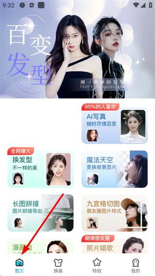 2、登錄后進入首頁,可看到百變發型等功能入口,還有AI寫真、換發型、魔法天空等熱門功能,底部有首頁、換裝、特效、我的等導航選項。