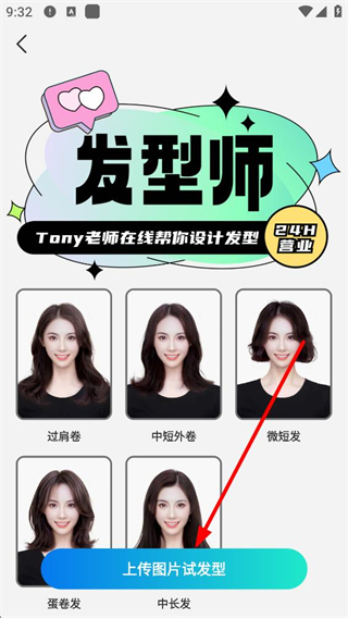 3、發型師界面,有過肩卷、中短外卷、微短發等多種發型可供選擇,點擊上傳圖片試發型,可體驗在線設計發型的服務。
