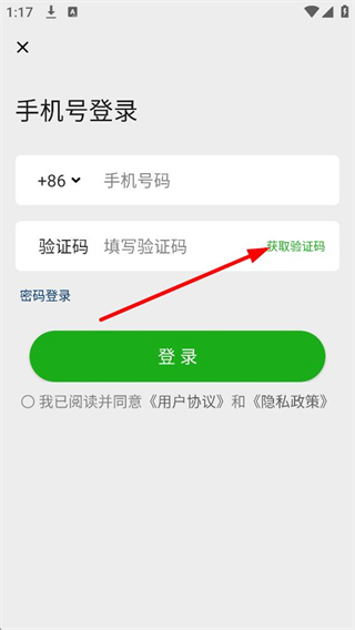 3、驗證碼登錄頁面,輸入手機號碼,點擊獲取驗證碼,輸入收到的驗證碼后點擊登錄,勾選同意用戶協議和隱私政策即可完成登錄。