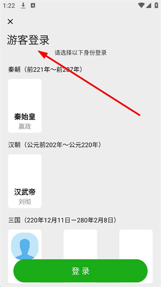 4、還可選擇游客登錄,游客登錄頁面選擇歷史朝代身份,如秦朝秦始皇、漢朝漢武帝、三國等身份,點擊登錄即可進入應用。