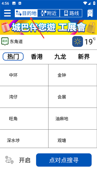 1、進入目的地界面,起點設為東角道,可選擇熱門分類下的香港九龍新界地點,選好后點擊點對點搜尋,開啟公交查詢流程。