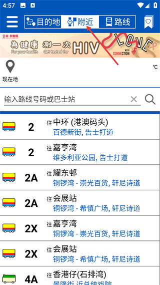 2、切換到附近界面,可輸入路線號碼或巴士站,能看到多條巴士線路及對應行駛方向、??空军c,便于查找所需線路。