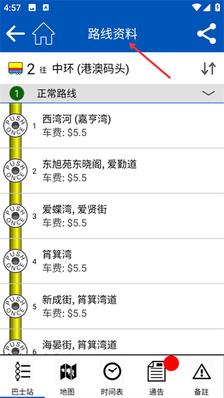 3、進入路線資料界面,可查看具體巴士的正常路線,包含各??空军c及統一車費,還能通過底部功能按鈕查看更多信息。