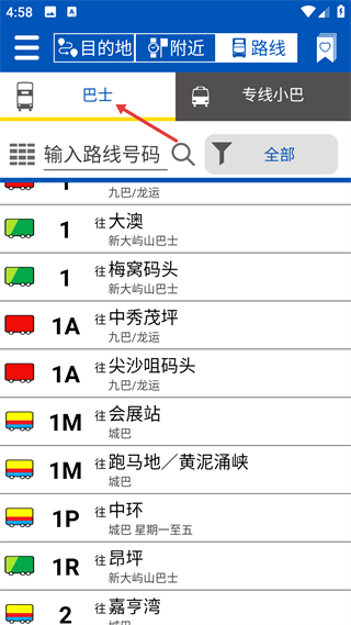 4、切換到路線界面的巴士分類,可輸入路線號碼搜索,展示不同公司的線路及行駛方向,方便篩選目標公交。