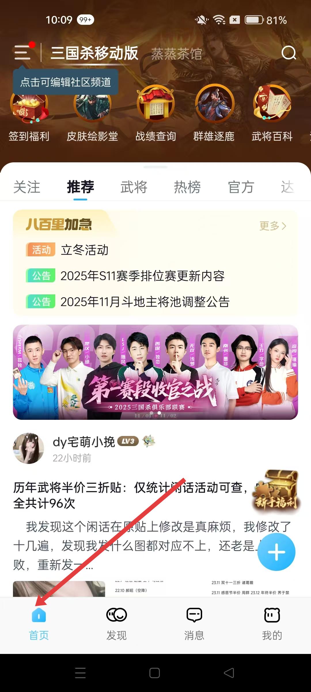 1、三國殺移動版社區首頁,可瀏覽活動公告、玩家帖子,還能查看簽到福利、皮膚繪影堂等功能入口。