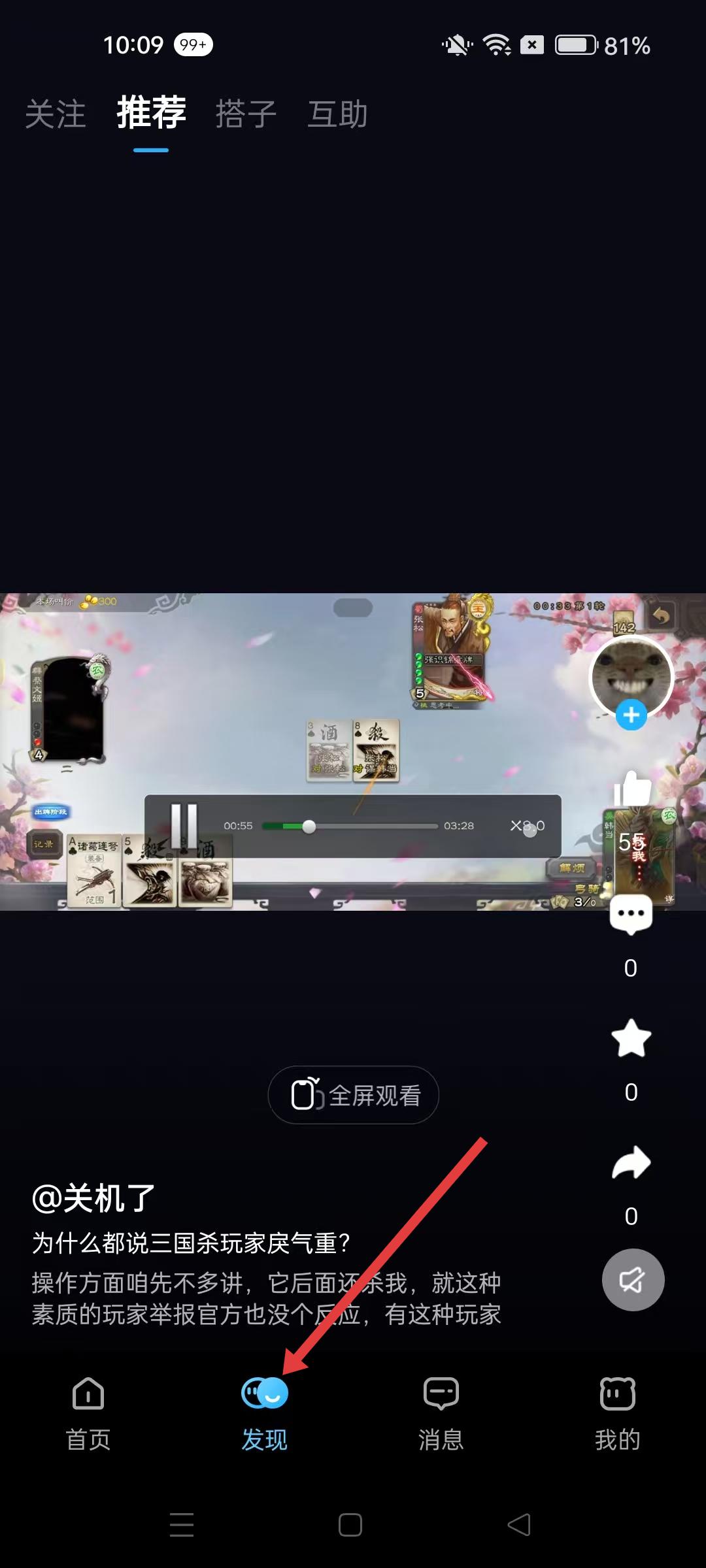 2、點擊發現,可進入發現頁面,查看推薦的三國殺相關視頻,了解玩家討論的游戲話題。