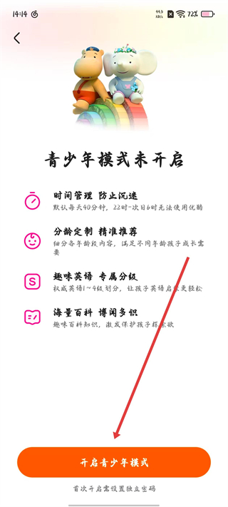 4、在青少年模式頁面可了解青少年模式的時間管理、內容定制等優勢,點擊開啟青少年模式可設置獨立密碼。