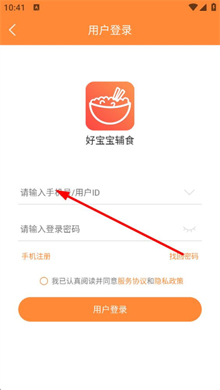 3、用戶登錄界面,輸入手機號、用戶ID和登錄密碼,勾選同意服務協議和隱私政策后點擊用戶登錄,也可選擇手機注冊或找回密碼。