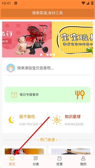 1、首頁有搜索欄,可搜菜譜、食材工具,還有能不能吃、知識星球等板塊,以及熱門食譜推薦,助力寶媽育兒飲食查詢。