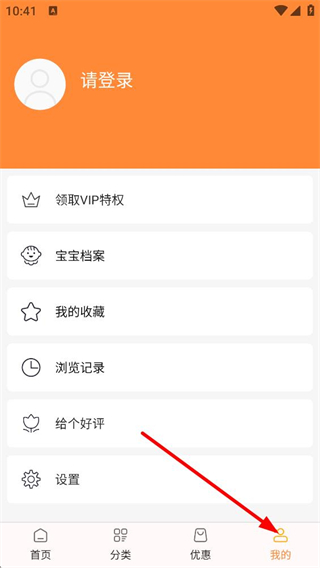 2、點擊底部我的,進入個人界面,可進行登錄,有領取VIP特權、寶寶檔案、我的收藏等功能選項,可管理個人相關信息和收藏內容。