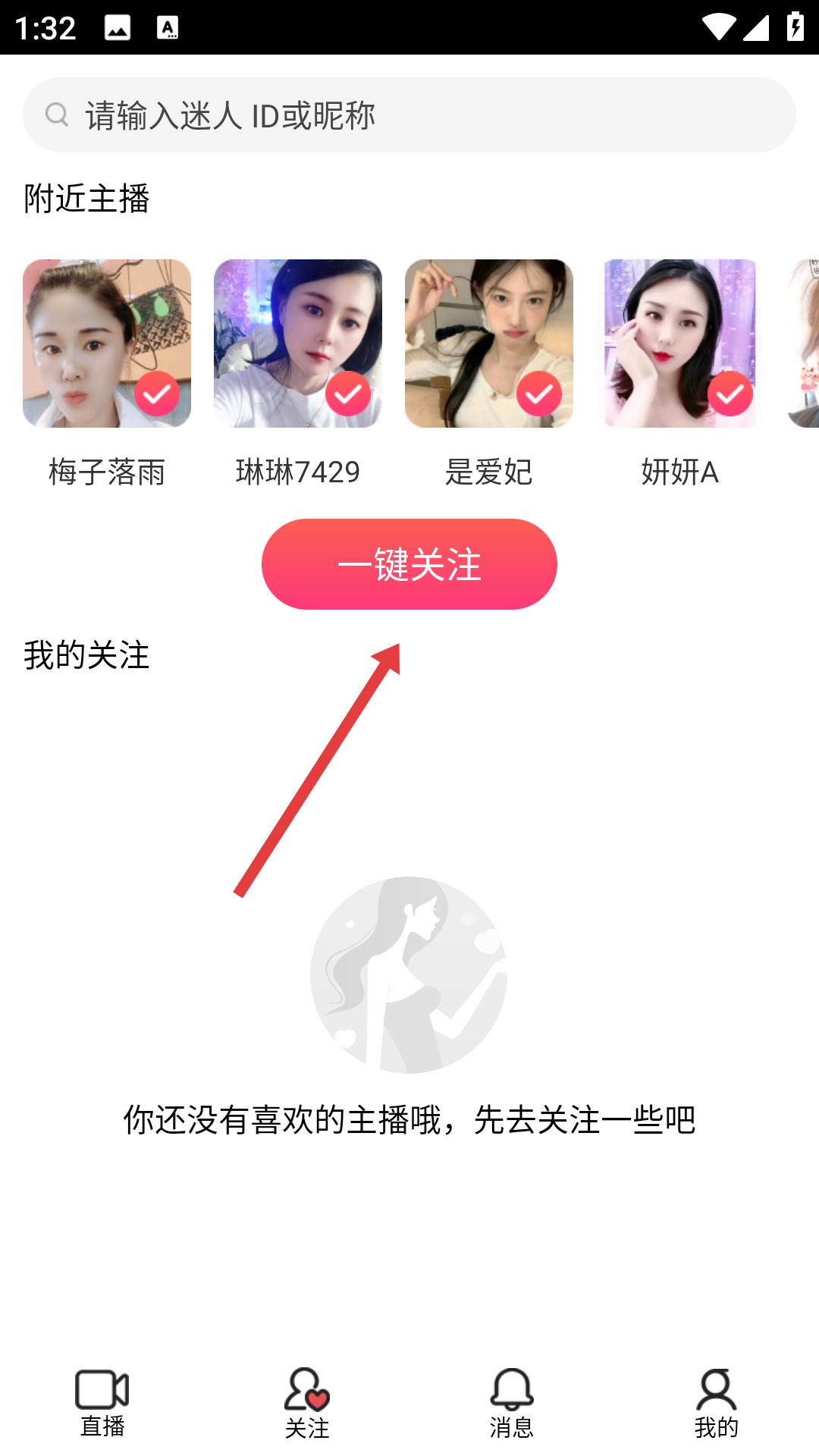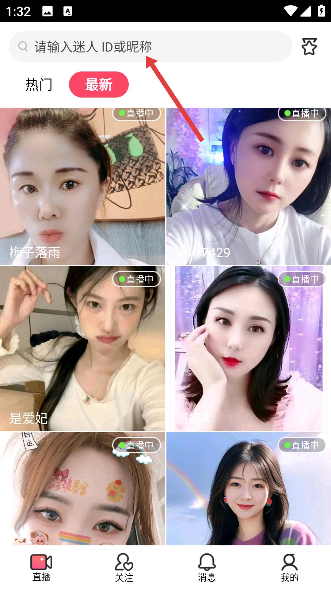 2、在關注頁點擊搜索欄,輸入主播ID或昵稱,查找心儀主播,進入其直播間觀看。