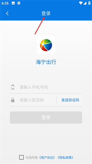 1、登錄界面支持手機號加驗證碼登錄,需勾選同意相關協議,是使用海寧出行應用交通服務的權限驗證入口,對接本地出行功能。