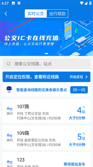 3、實時公交頁提供實時公交與出行規劃功能,展示線路到站信息,支持定位查附近線路,是公交出行的核心信息頁。