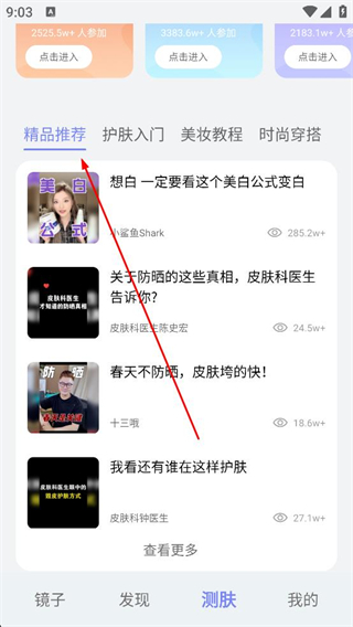3、進入測膚板塊查看精品推薦內容,選擇護膚入門美妝教程等分類,瀏覽美白防曬護膚相關文章,點擊感興趣的內容進入詳情頁了解具體信息。