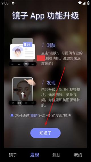 1、打開軟件查看功能升級提示,了解測膚功能可提供專業測膚,發現板塊新增小視頻模塊涵蓋護膚美妝內容,點擊知道了關閉提示進入主界面。