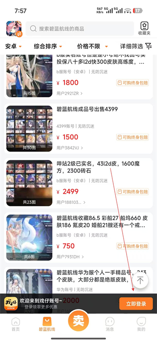 1、進入軟件首頁,瀏覽游戲賬號商品列表,點擊下方的登錄按鈕,登錄后解鎖更多的功能。