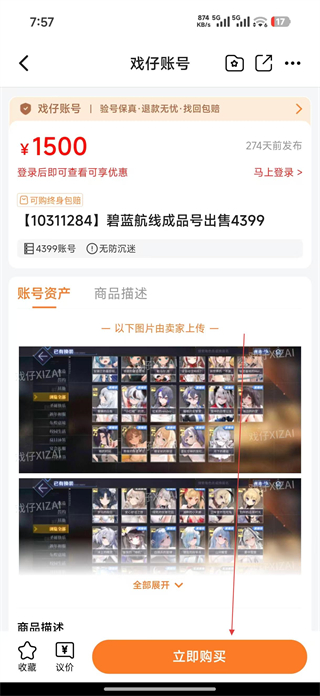 4、在商品詳情頁查看商品描述的詳細信息,確認賬號信息符合需求后,點擊立即購買按鈕,進入訂單支付流程完成交易。