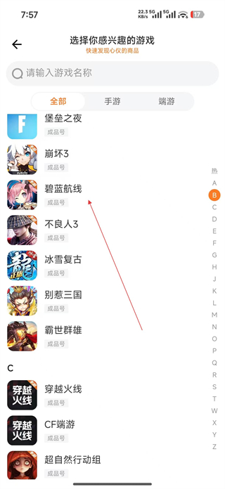3、登錄后進入選擇游戲頁面,瀏覽手游端游分類下的游戲列表,選擇目標游戲點擊進入,查看該游戲對應的賬號商品列表。