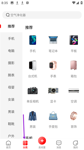 2、分類板塊,細分手機、電腦、攝影等品類,每個品類下有具體商品分類,方便用戶精準查找閑置物品。