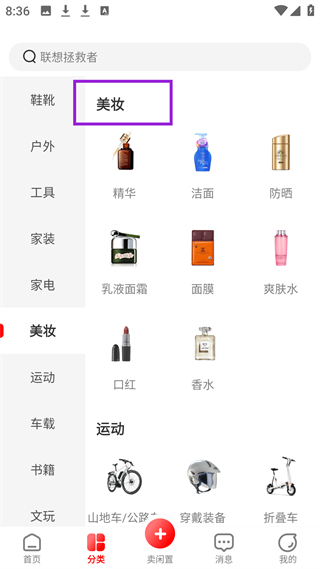 3、美妝分類板塊,細分精華、潔面、防曬等子分類,涵蓋多種美妝產品類型,方便用戶篩選美妝類閑置物品。
