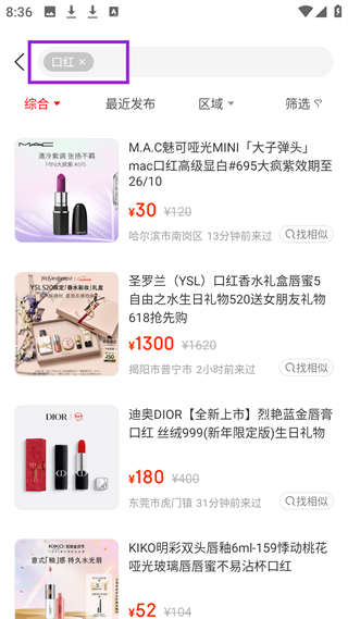4、口紅商品列表頁,展示M.A.C、圣羅蘭、迪奧等品牌口紅,標注價格、優惠及所在地信息,助力用戶選購口紅類閑置物品。