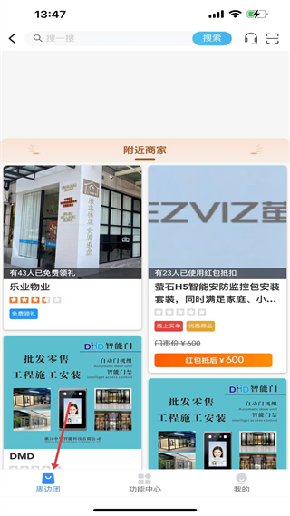 1、周邊團展示樂業物業、螢石安防等附近商家,提供免費領禮、紅包抵扣等服務,用戶可了解周邊商業服務。