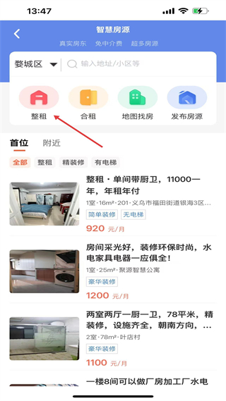 2、智慧房源有整租、合租等租房方式,展示義烏、葉店村等地房源,標注租金、戶型等信息,用戶可查找租房。