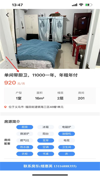 3、義烏單間房源詳情說明租金、戶型、面積和配套設施,用戶可聯系房東租房。