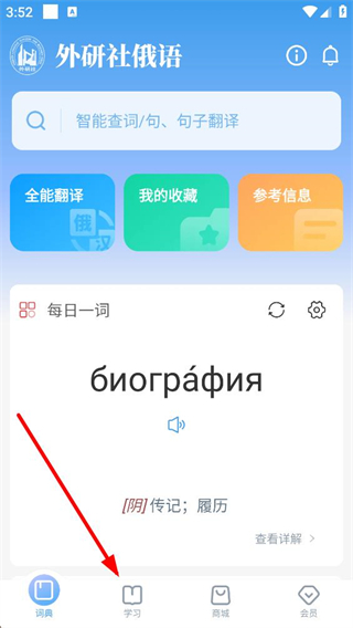 1、進入外研社俄語的詞典頁面,頂部設有智能查詞句的搜索框,還有全能翻譯等功能按鈕,頁面展示每日一詞的俄語內容,點擊底部學習按鈕,可進入對應的學習板塊。