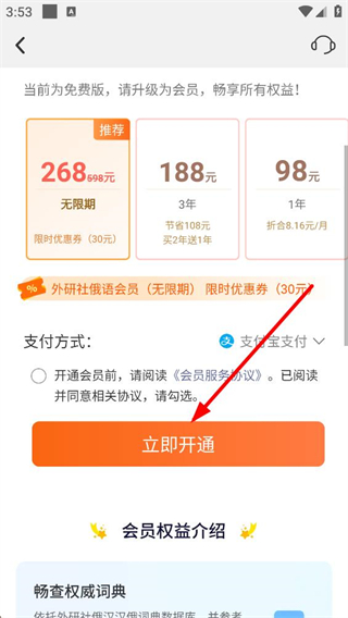 4、進入會員開通頁面后,可見無限期、3年等不同會員套餐,可使用限時優惠券抵扣費用,勾選協議后點擊立即開通,即可升級會員享受權益。