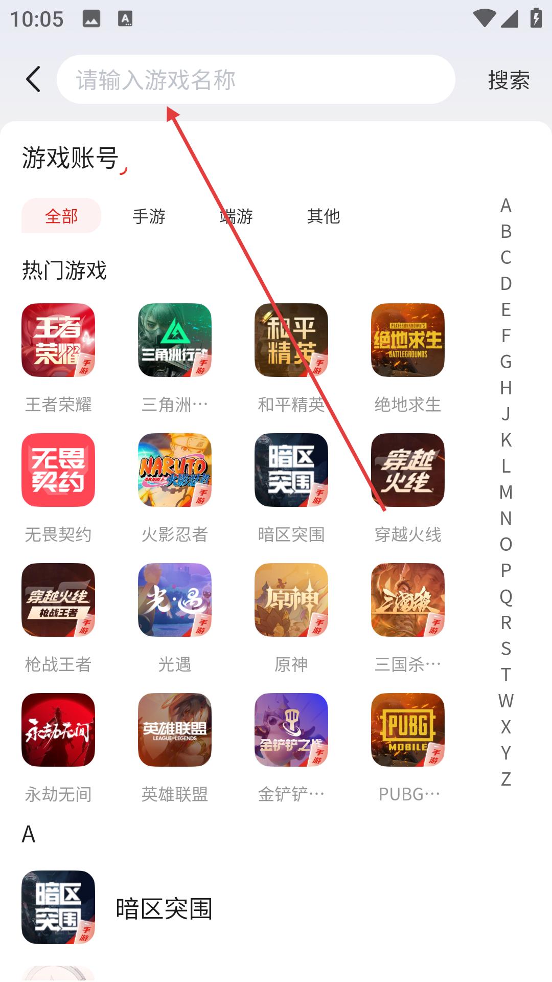 2、查看指南后點擊搜索欄輸入想要購買的游戲名稱,開啟游戲賬號搜索流程。