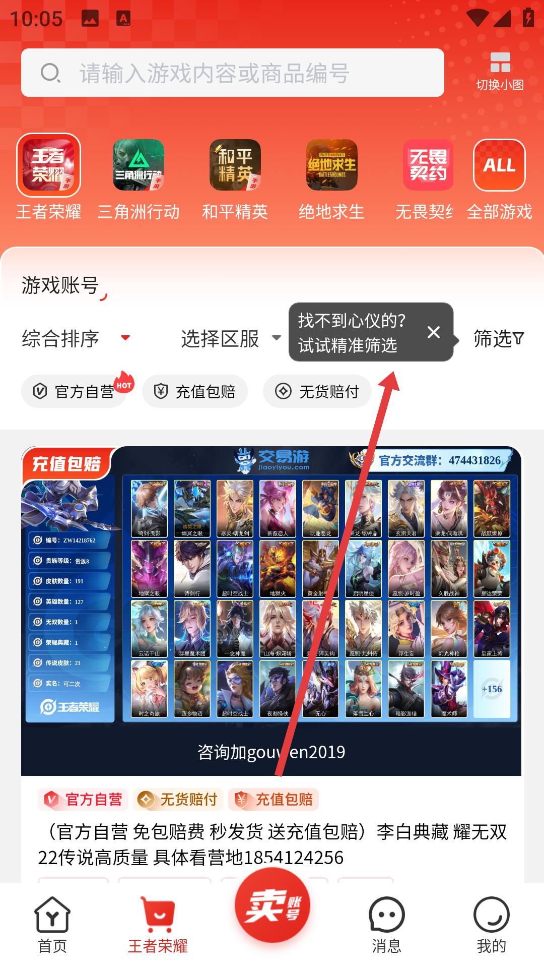 4、在賬號列表頁若找不到心儀賬號,點擊精準篩選,設置篩選條件如區服、賬號類型等,找到符合需求的游戲。