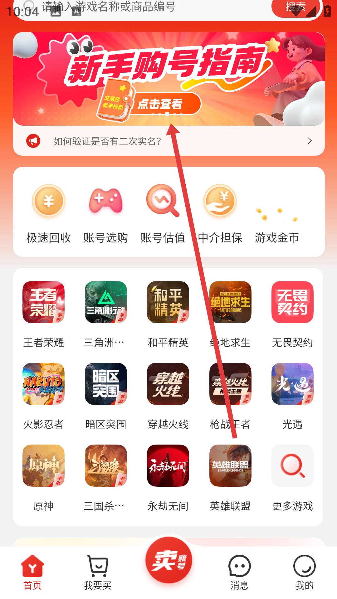 1、進入軟件首頁,點擊新手購號指南,查看瀏覽游戲選號、聊一聊立即購買、購買成功等步驟,了解賬號交易流程。